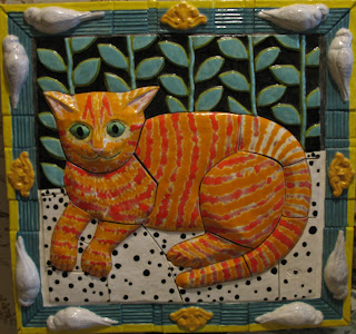 Animals are definitely in my world, especially cats. I thought I would show my tile inspired by Walter, who is now in "kitty heaven". It is approximately 21" w x 20" h and is in sections glued to a board. The print was done using masonite. I made it during the last half of the 1960s. AND.... the sketch of the coat hangers somehow reminded me of animals.